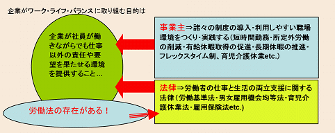 企業がワーク・ライフ・バランスに取り組む目的は「社員が働きながらでも、仕事以外の責任や要望を果たせる環境を確保すること。」とするならば、事業主は諸々の制度の導入をするだけでなく、利用しやすい職場環境をつくり、実践することが重要になってきます。具体的には、短時間勤務・所定外労働の削減・有給休暇取得の促進・長期休暇の推進・フレックスタイム制・在宅勤務・事業所内保育施設の設置・育児介護休業などさまざまなことが考えられます。そこで、企業が実践して行くであろう制度に深く係わっていくのが、「労働者の仕事と生活の両立支援に関する法律」です。具体的には、労働基準法・男女雇用機会均等法・育児介護休業法・雇用保険法などで、これらを、労働法と呼んでいます。この労働法の存在こそが、ある意味で、企業が、ワーク・ライフ・バランスの取組みをすることを規制し、労働者にとっては、担保されていると言えるかも知れません。